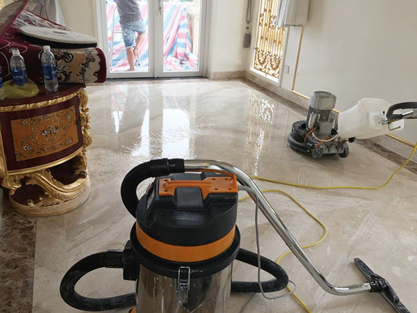 – Dùng máy đánh sàn, bàn chải đánh sàn, hóa chất làm sạch các vết bẩn bám trên sàn và tường men ốp.